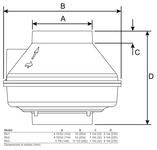 Rn1 Inline Radon Fan; replaces the HP2133. The Rn1 is specifically designed for applicatios where low pressure and low flow are needed. This fan is a perfect choice where there is good sub slab cummunication and a small foot print. The two piece housing is melted together to form a single piece air tight housing.
